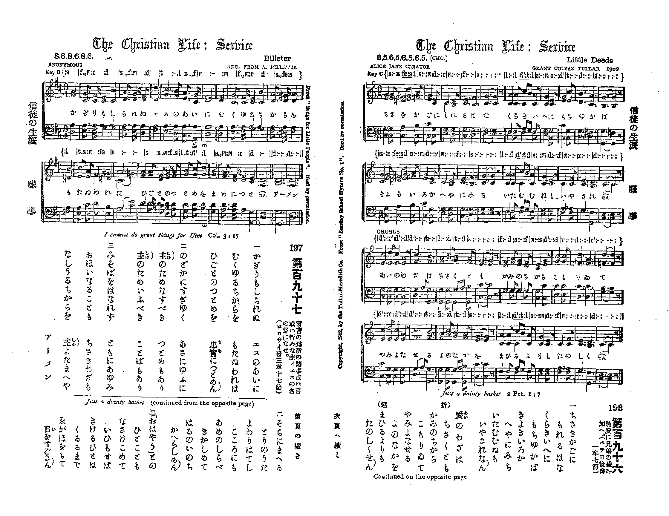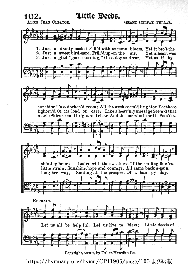 今回取り上げる「小さなかごに花を入れ」 (Little Deeds)は、とても可憐な子ども(日曜学校)の歌で、神様は、たとえ小さくても優しいわざを用いて下さり、人生を明るくしてくださります、と歌っています。