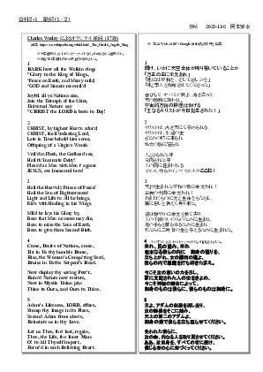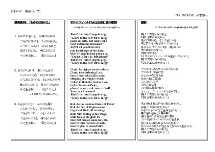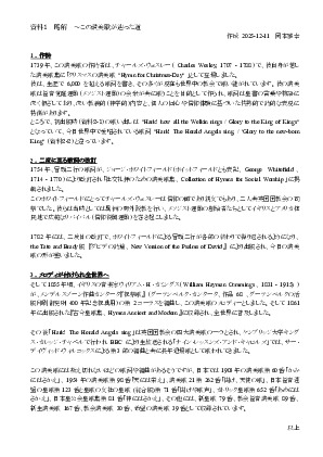 歌詞は、1739年、チャールズ・ウェスレー自身が著した讃美歌集に初めて登場しました。この時の歌い出しは今日と違って "Hark! how all the Welkin rings / Glory to the King of Kings" (資料2-1)でしたが、15年後にウェスレーの友人ジョージ・ホワイトフィールドにより改訂(資料2-2)されて出版されました。